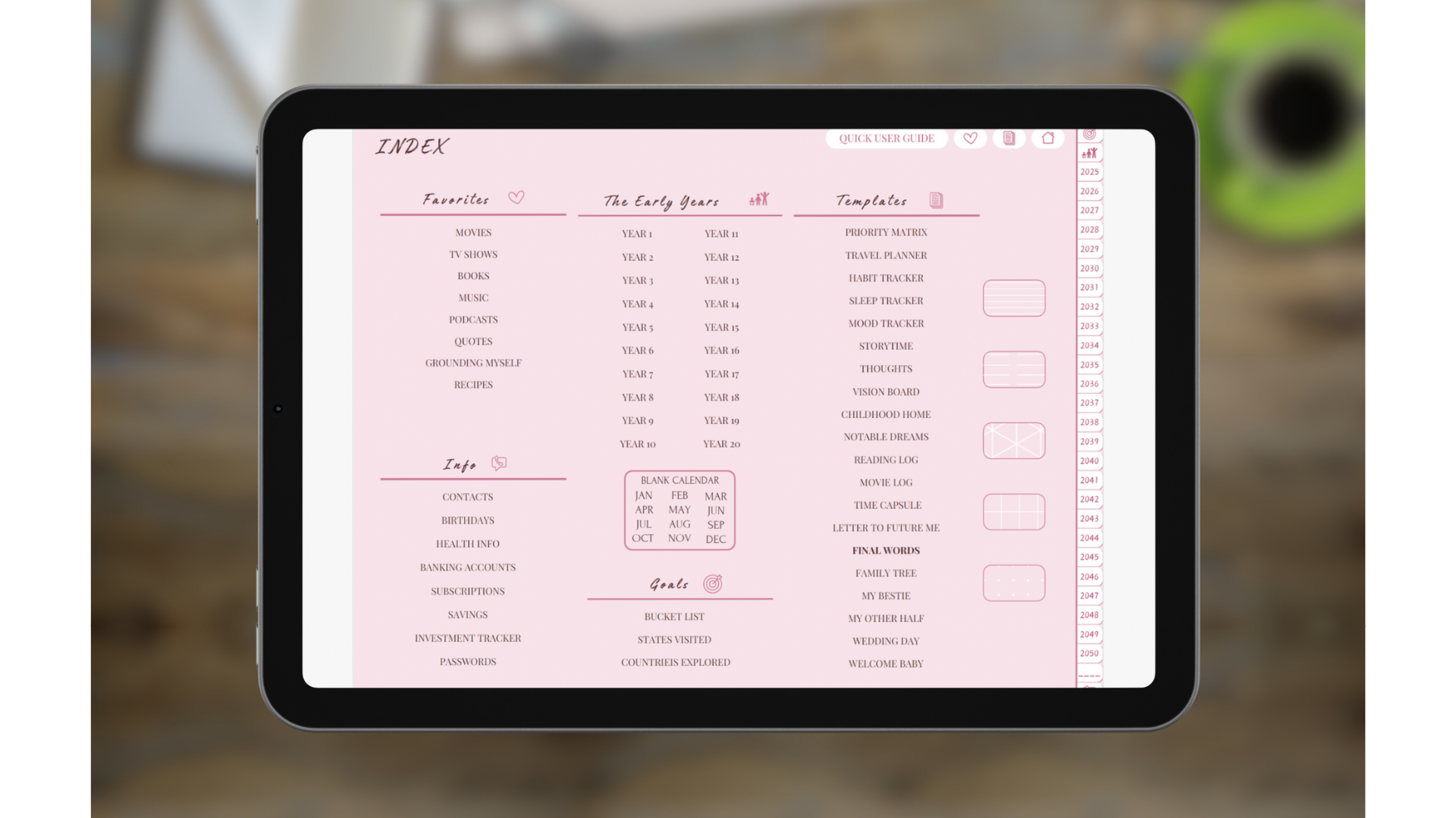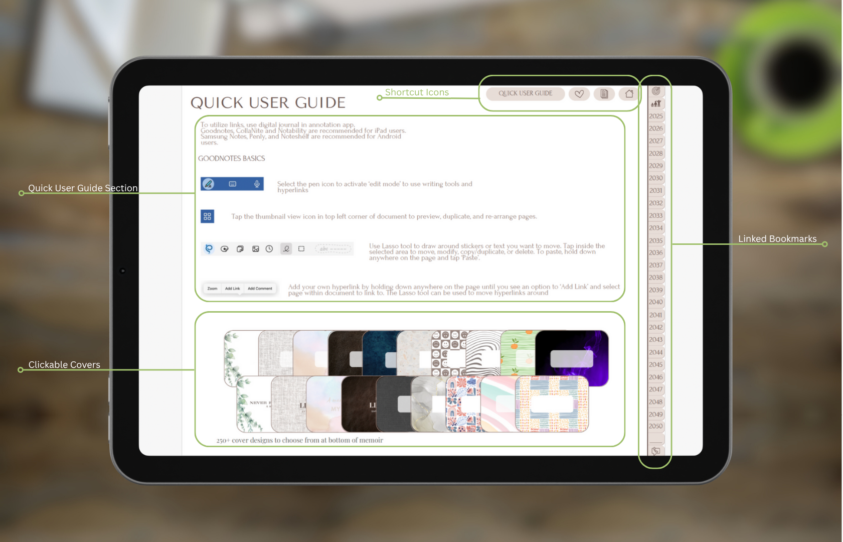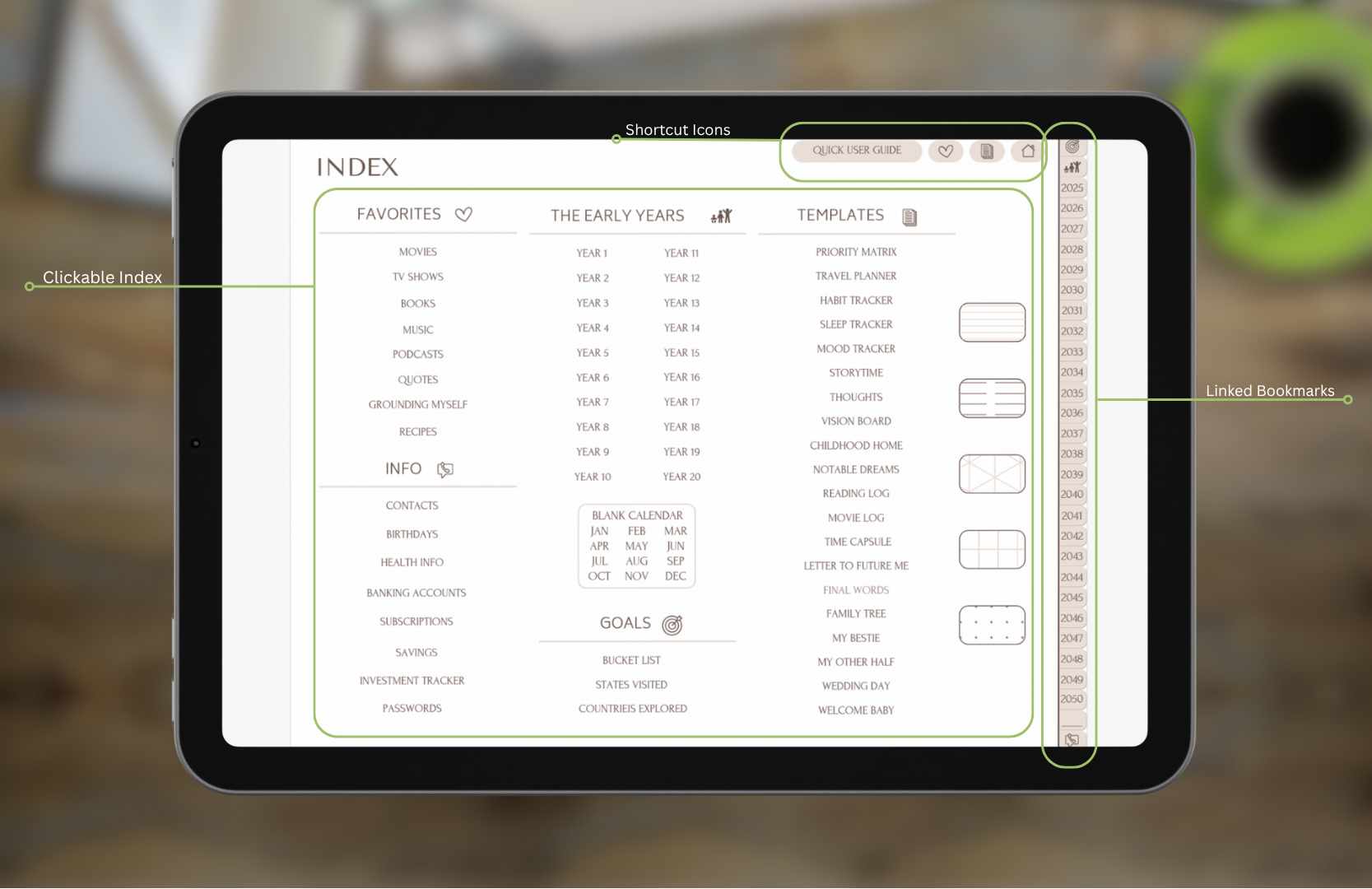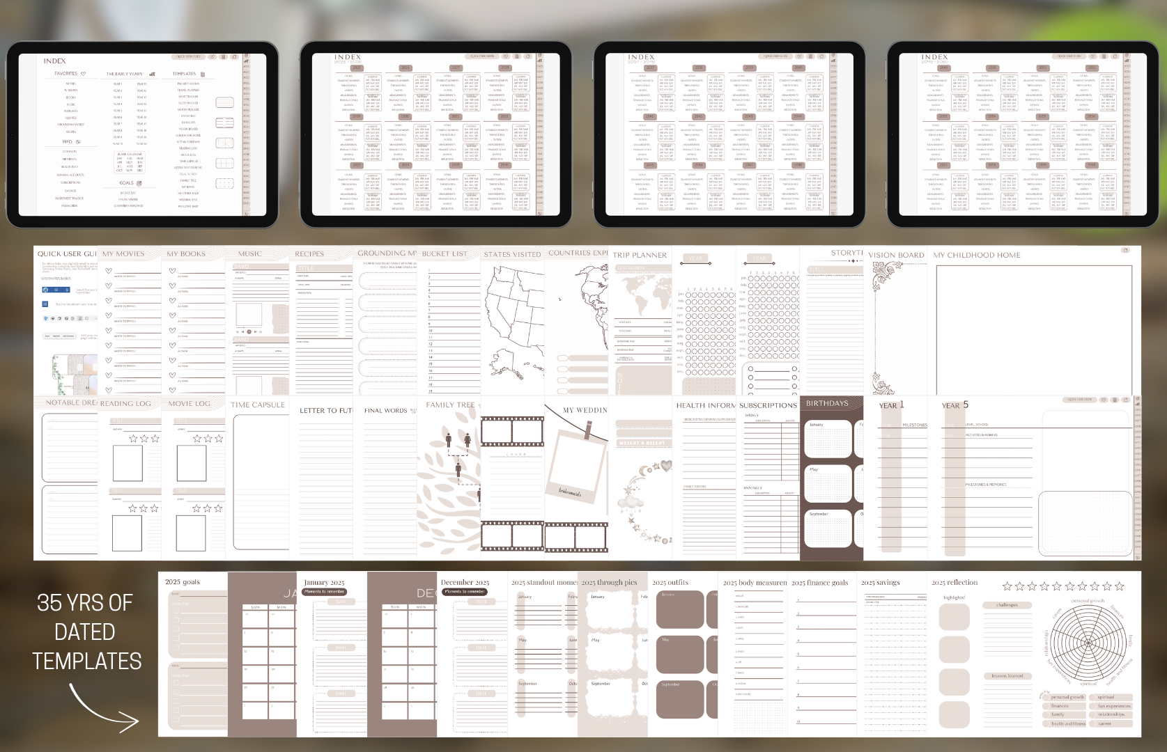 Blending journaling, scrapbooking, planning, and tracking, this interactive memoir is thoughtfully structured with hyperlinks for seamless navigation and made for apps like GoodNotes and Notability.