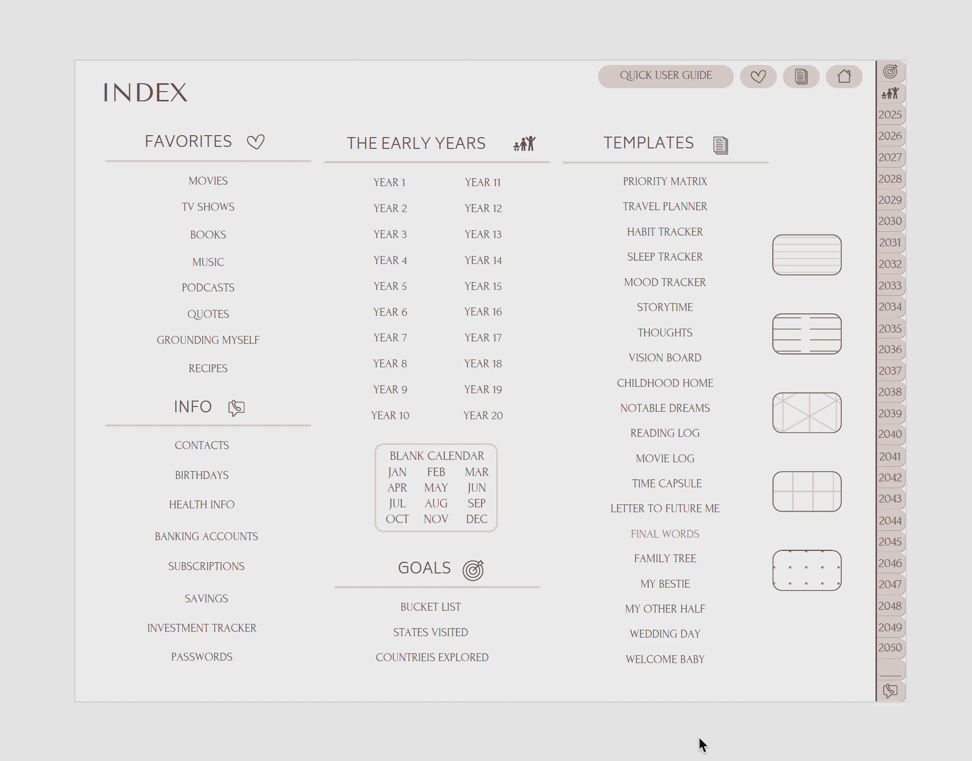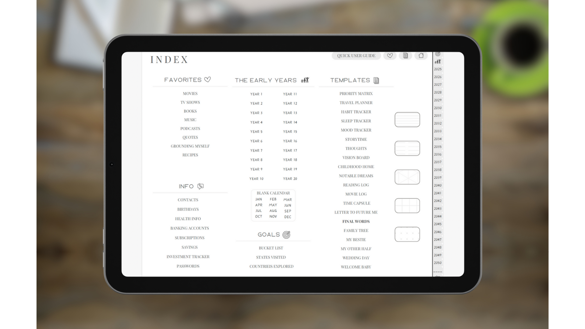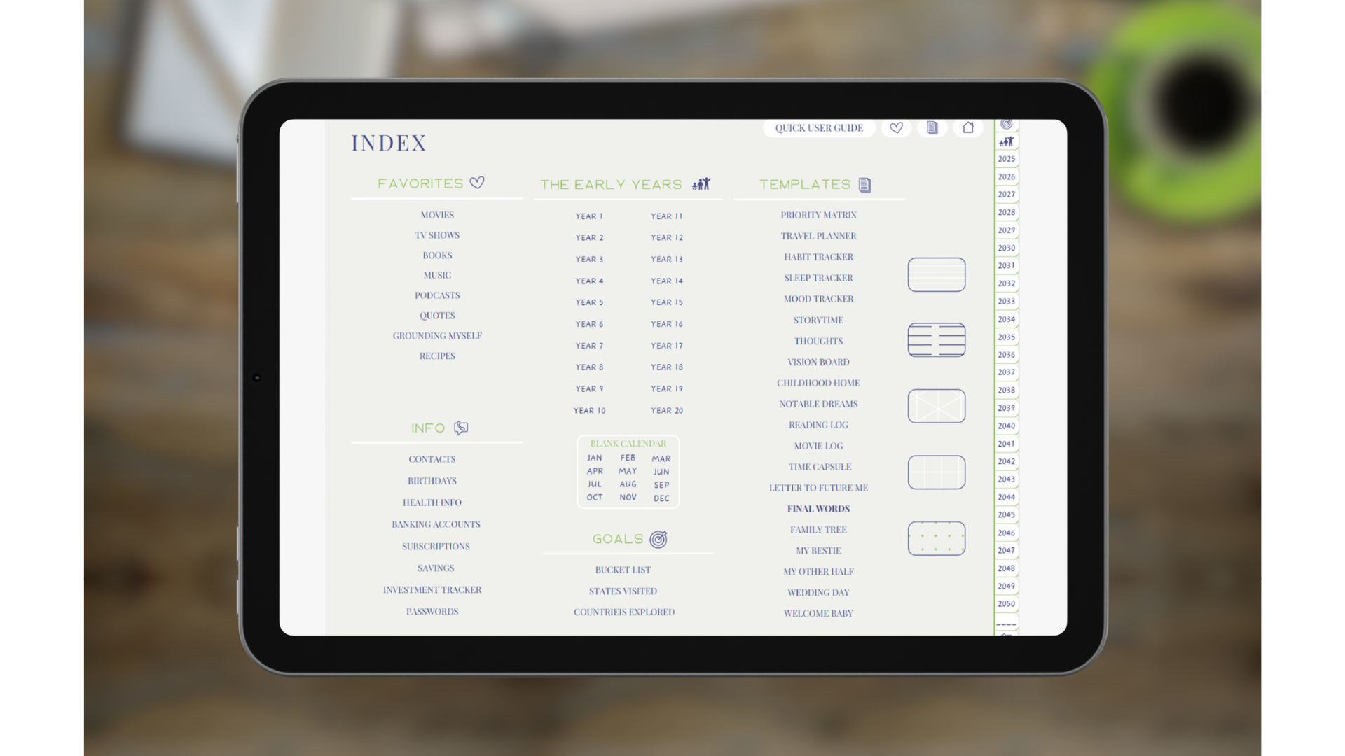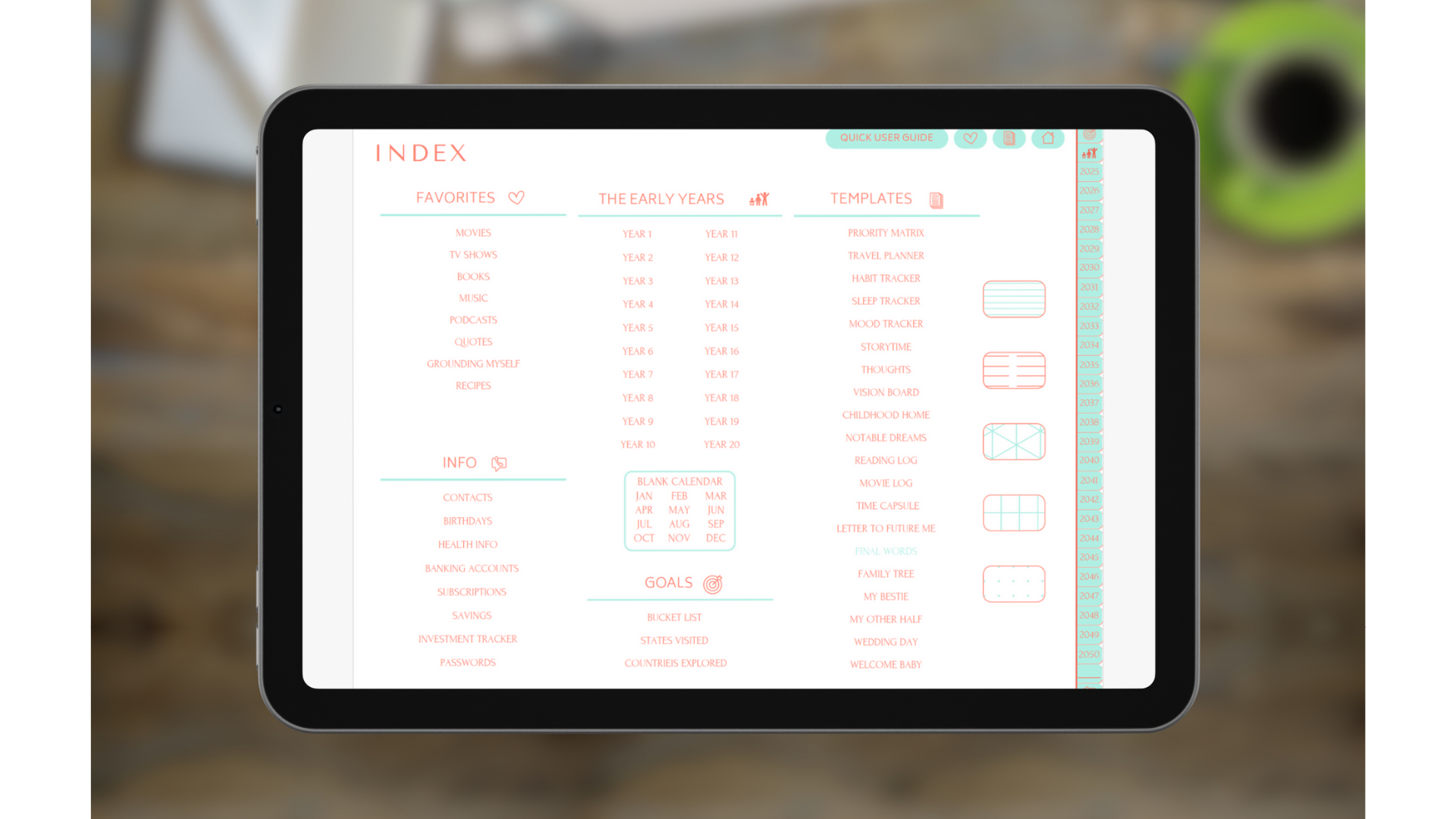 Blending journaling, scrapbooking, planning, and tracking, this interactive memoir is thoughtfully structured with hyperlinks for seamless navigation and made for apps like GoodNotes and Notability.